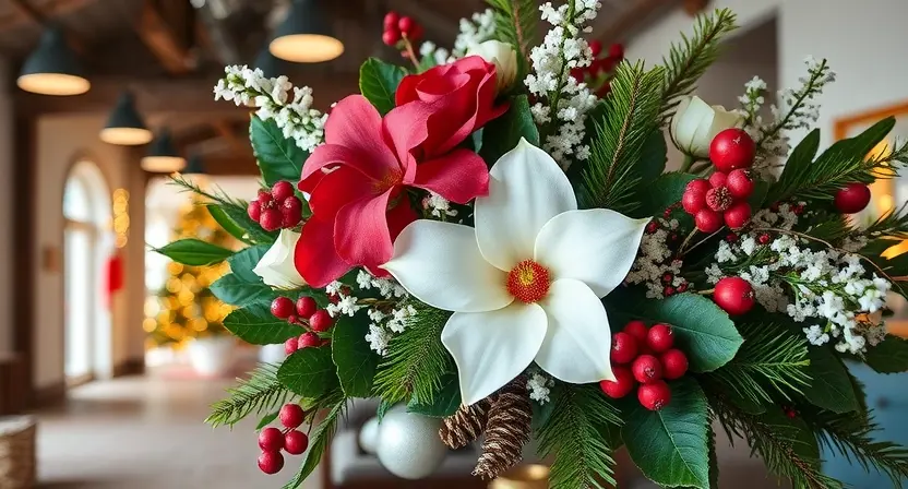 | Классический (Рождественский) | Красный, зеленый, золотой | Нобилис, красные розы, илекс, золотые шары | Торжественный, яркий, традиционный |