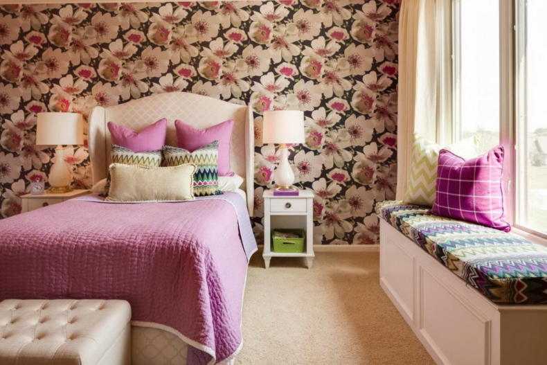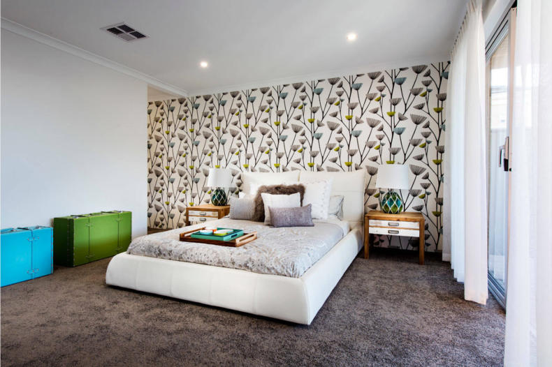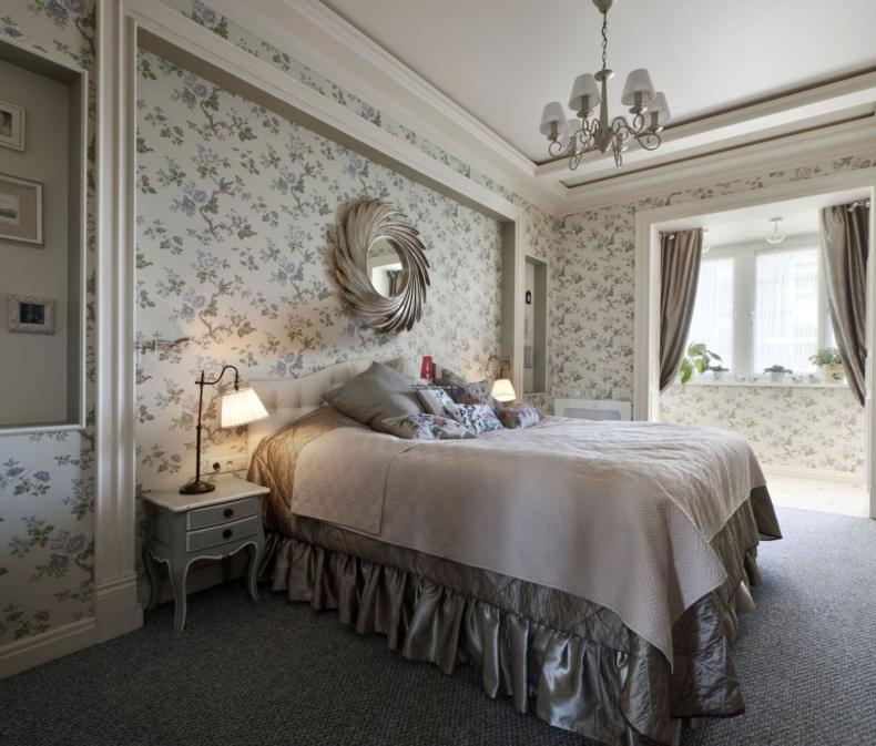 Изменить зрительное восприятие спальни помогают рисунки. Вертикальная полоса или вертикальные цепочки мелких цветочков, геометрических фигур визуально увеличивают высоту потолка. Обои с горизонтальными узорами «отодвигают» стенку, их наклеивают на длинные стены в узких комнатах, чтобы помещение казалось квадратным.