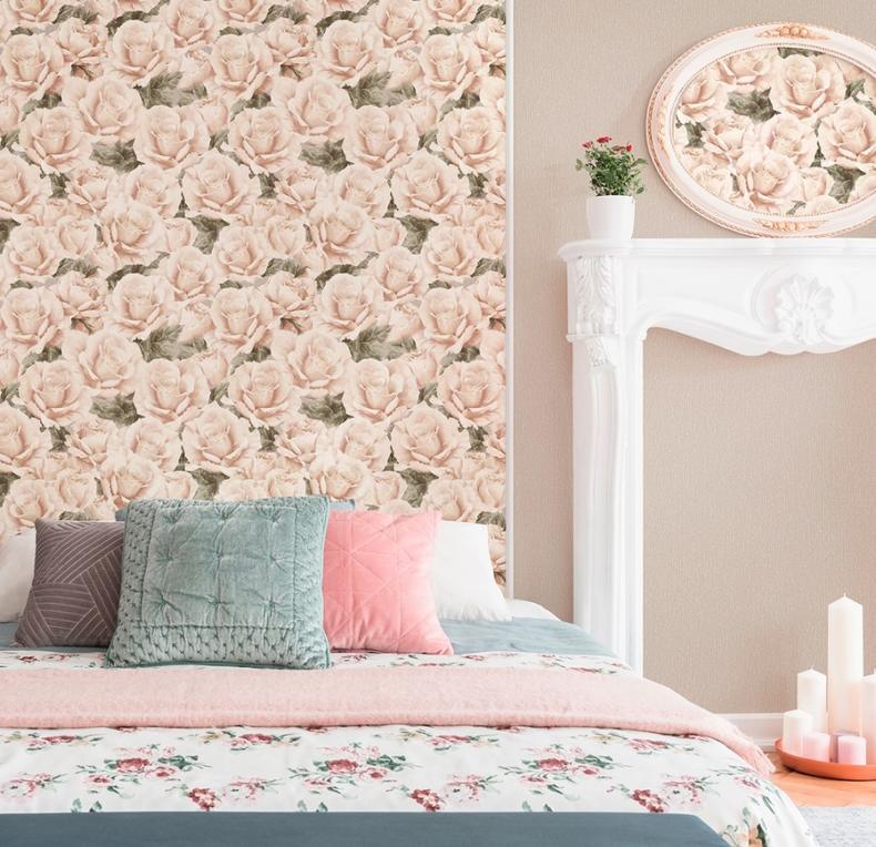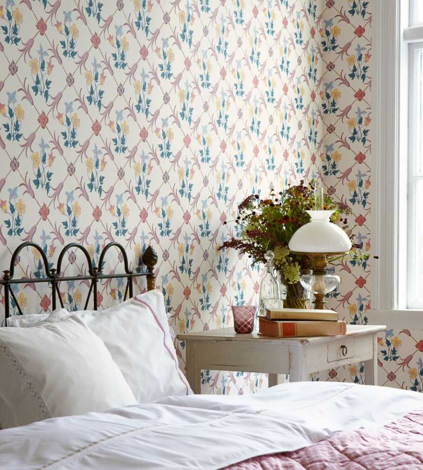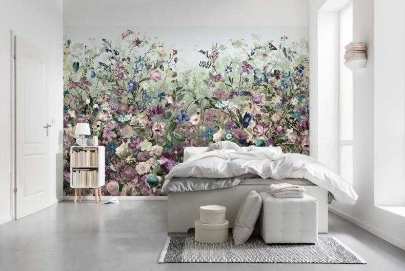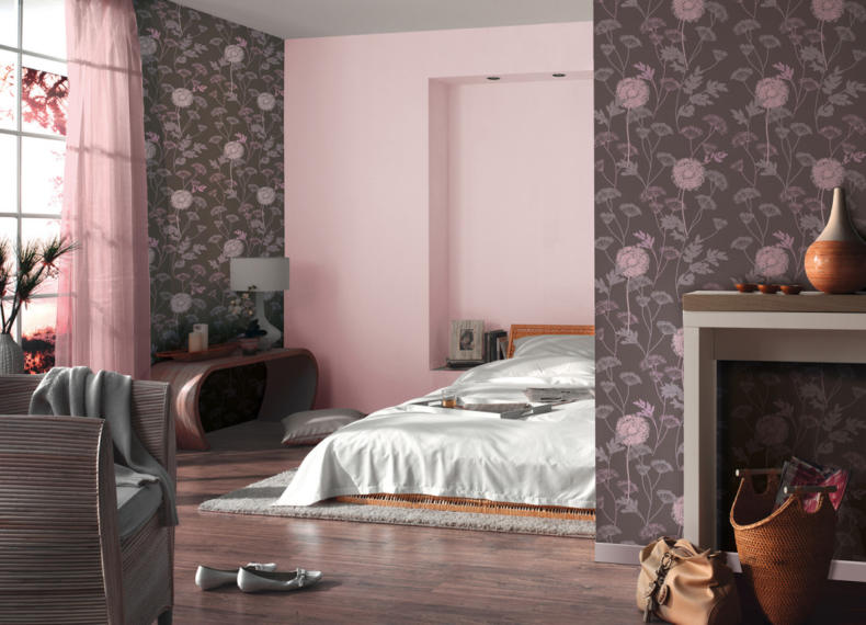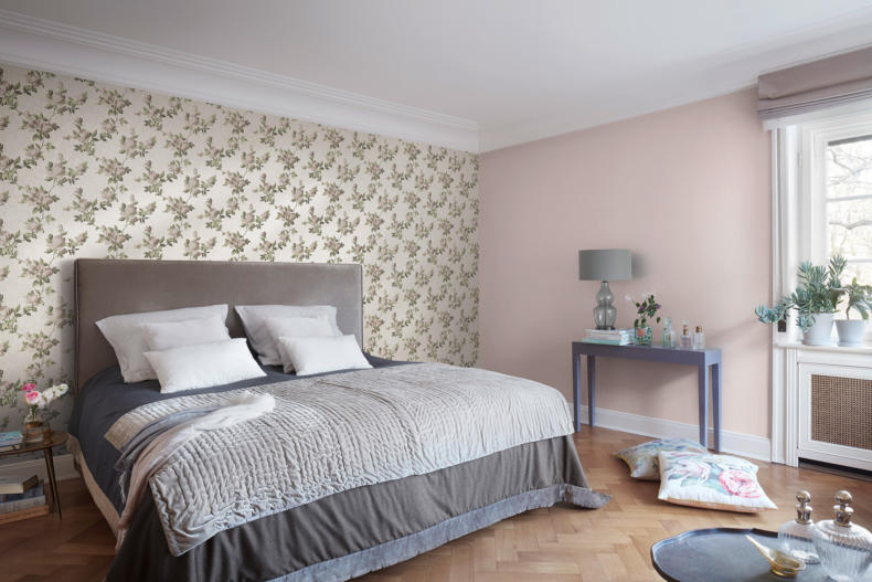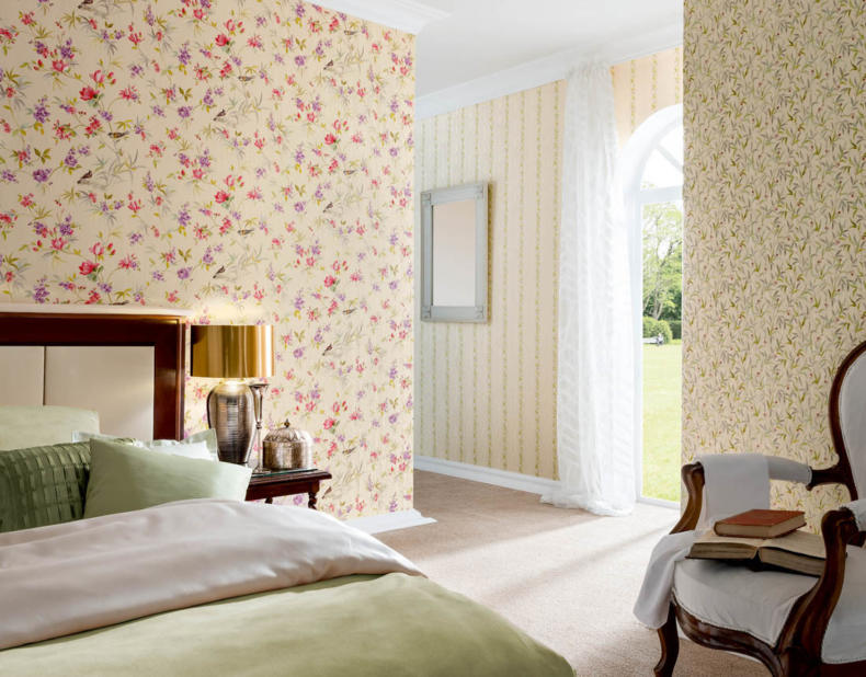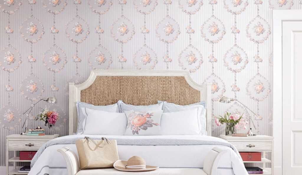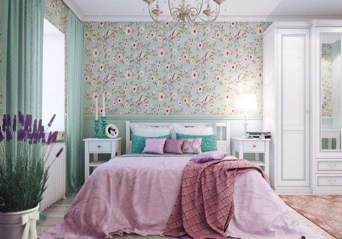 Обои в мягкой палитре розовых, голубых, зеленых, желтых, бежевых и лавандовых оттенков — идеальное решение для романтической спальни. Такое оформление очень понравится всем почитателям легких, воздушных интерьеров.