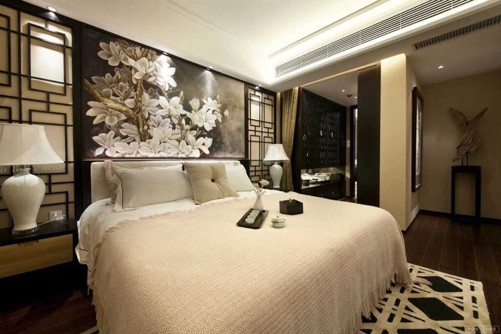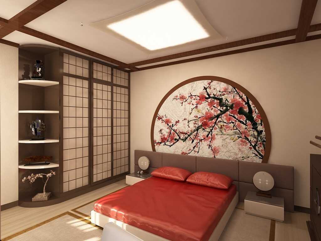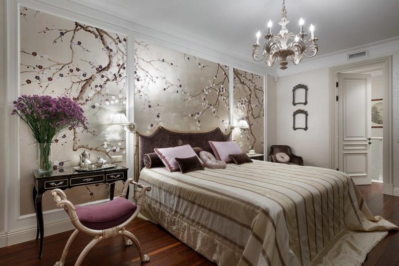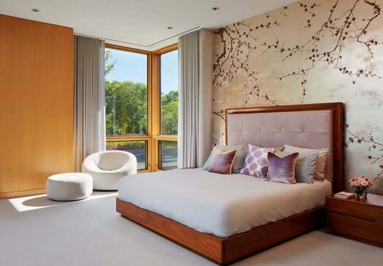 Очень красиво смотрятся (помимо всего прочего, это еще и хит сезона) обои, выполненные в азиатском стиле. Для взрослой спальни идеально подходят изображения китайских и японских фруктовых деревьев, дворцов, изображения небольших сражений. Такие изображения всегда выполняются в спокойных и неброских тонах и прекрасно сочетаются с яркими цветами.