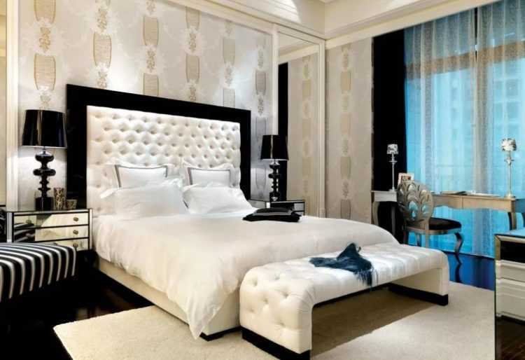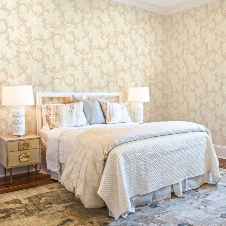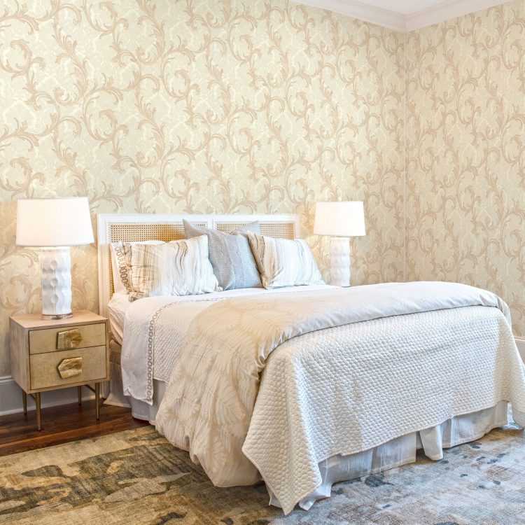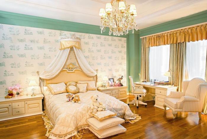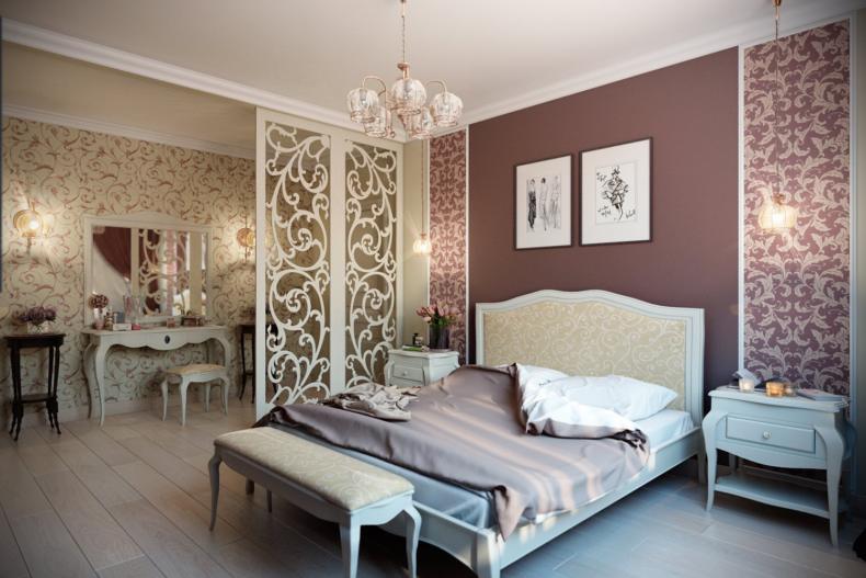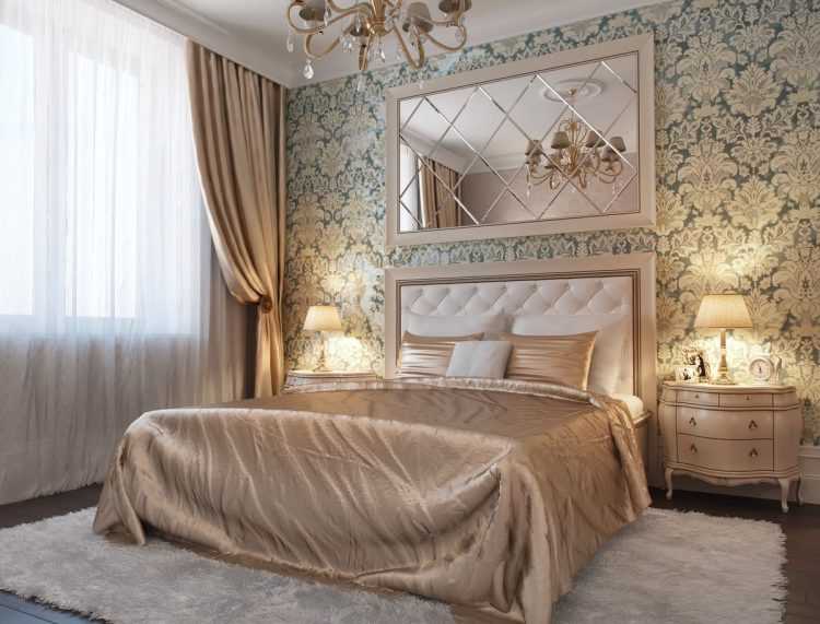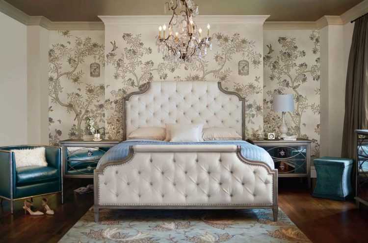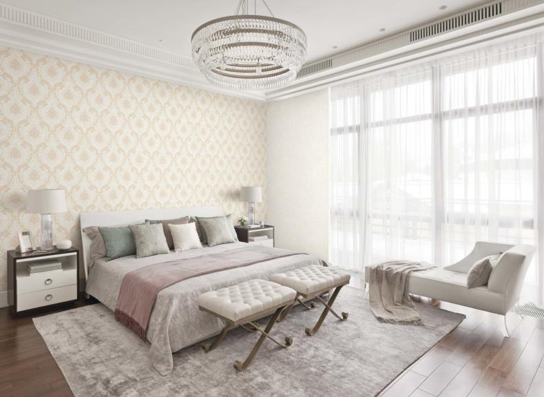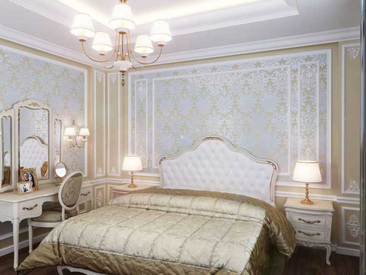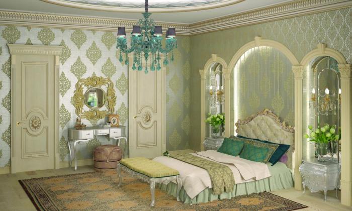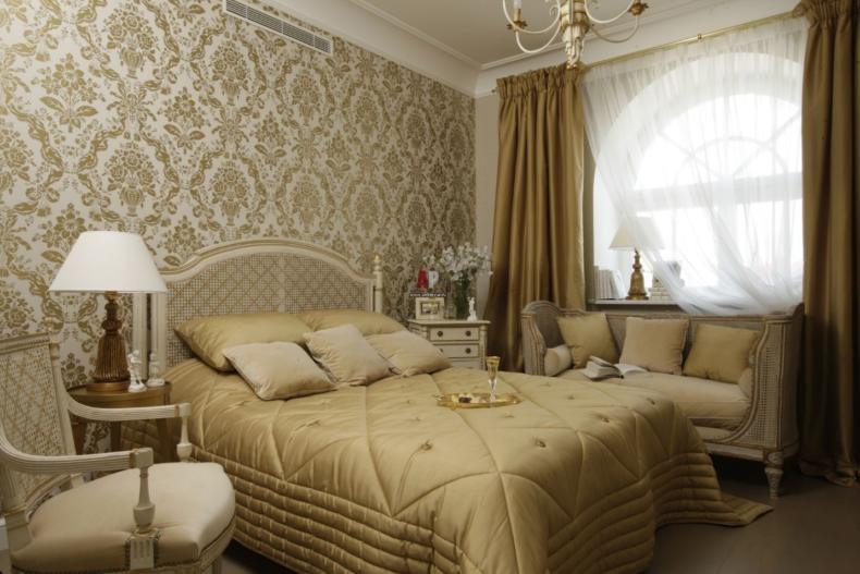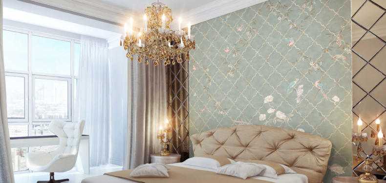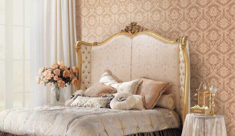 Этот стиль объединяет монументальность античных времен с изысканной роскошью эпохи Возрождения. Настоящую королевскую спальню можно обрамить обоями в теплых оттенках белого (сливочный, кремовый, айвори, светлый беж) с золотистым или серебряным растительным орнаментом, рельефом под гипсовую лепнину или мягкую кожу.