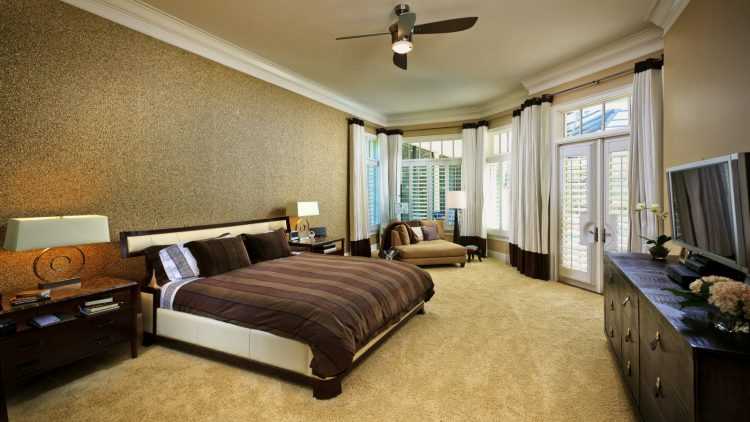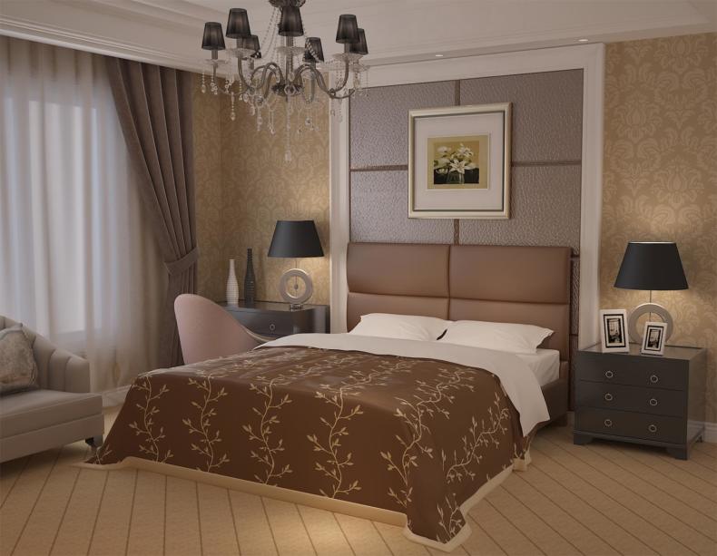 Обои для большой спальни выбрать проще. Они могут быть как в светлых, так и в тёмных тонах. Синие, зелёные, коричневые стены в насыщенной гамме придают комнате респектабельность, элегантность, создают ощущение стабильности и покоя. В просторном помещении особенно эффектно смотрятся покрытия с глубокой фактурой, крупными узорами.