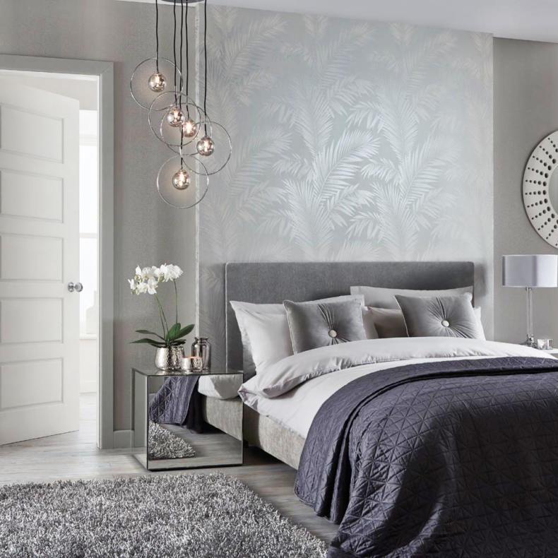 Нейтральные серые обои — оптимальное решение для спальни в стиле хай-тек, модерн, минимализм, лофт. В сочетании с черной или темно-синей мебелью и строгими линиями получится функциональный мужской интерьер; белый глянец и серебряные завитки — вариант для элегантной леди; ярко-желтые, розовые, зеленые акценты на сером фоне — для семейной пары.