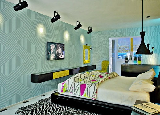 Так же можно использовать разные цвета однотонных обоев, контрастные полосы создают объем. Для интерьера в стиле хай-тек и минимализм подойдет использование функциональной мебели, кровати со встроенными шкафами, вместительные комоды и компактные светильники.