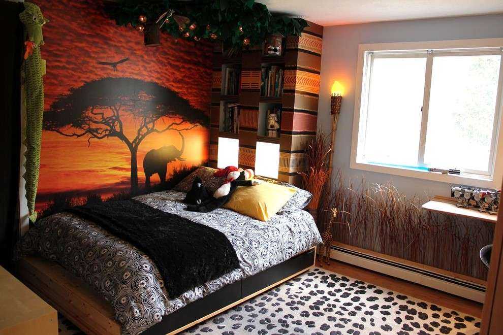 Если вы решили сделать спальню в таком стиле, нужно знать, что она может быть выполнена как в минималистичном стиле с кроватью и одной картиной, так и в достаточно нагроможденном, с большим количеством плакатов и предметов мебели. Обои в такую комнату подойдут в пастельной палитре, они должны обязательно сочетаться с остальной мебелью. Также отлично впишется и контрастная гамма, в ней обои могут иметь, например, красные и коричневые оттенки в сочетании с коричневой мебелью. Нельзя не отвести особое внимание монохромной палитре, обои, имеющие простые и легкие цвета, сделают комнату более уютной и спокойной.