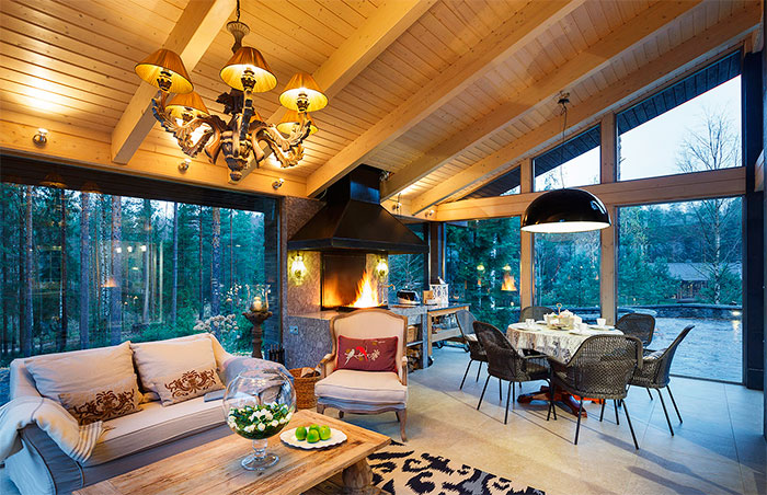 Интересна веранда в качестве каминной комнаты. Ее площадь моментально становится более респектабельной, наполняется комфортом и негой.