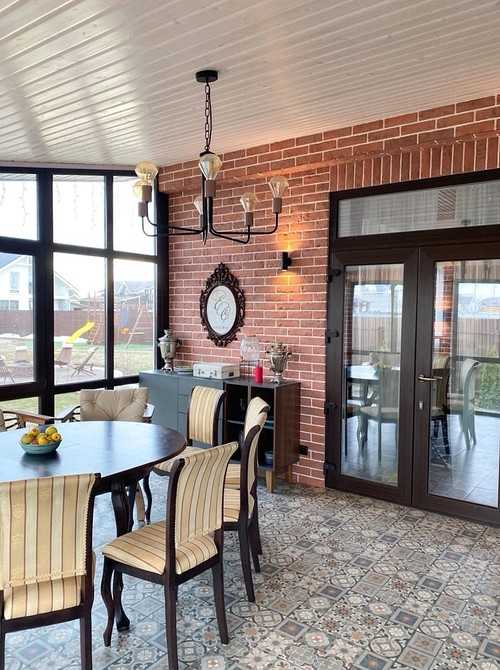 Чтобы выдержать веранду в едином стиле, необходимо использовать несколько элементов, задающих тон всему интерьеру. Так, камин из кирпича и каменные плиты пола в сочетании с деревянной кровлей укажут на эко-стиль вашего помещения. Такая стилистика подходит для людей любого возраста, чья душа стремится к естественности и природе.