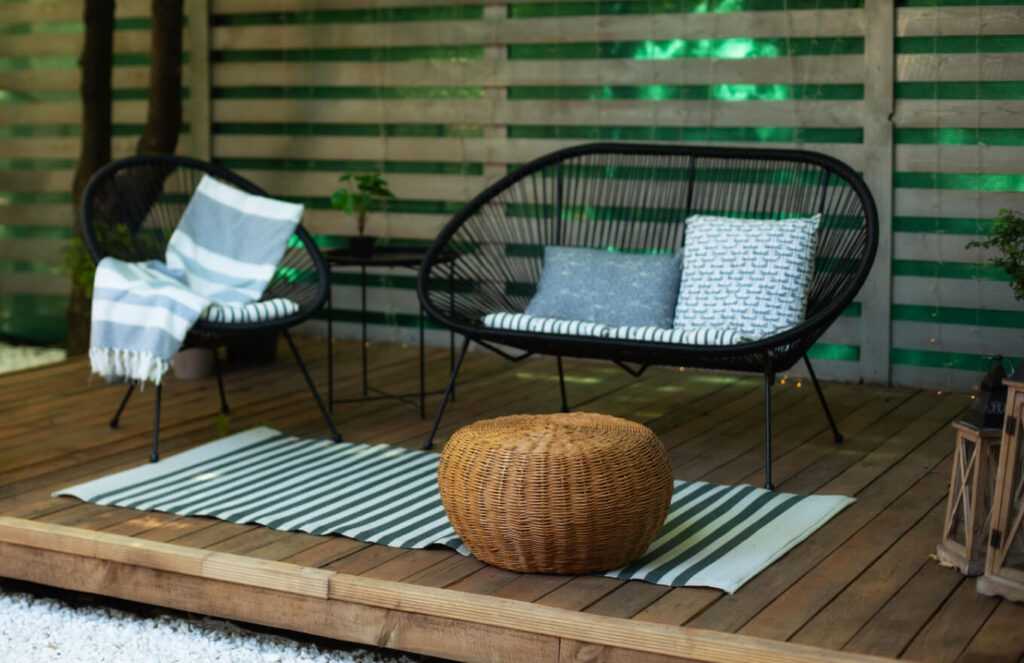 Мебель стоит выбирать из прочных материалов, которая с лёгкостью перенесёт разную погоду и температуру.