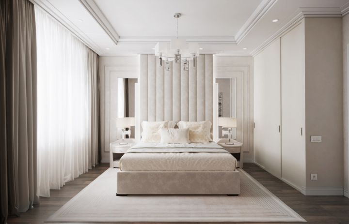 Спальня в стилі неокласика сподобається любителям елегантної розкоші. Напрямок передбачає використання дорогих матеріалів (шкіри, мармуру, граніту, натурального дерева). Характерними рисами стилю є арки, колони, бордюри, ліпнина та чіткі лінії. Як стельове і стінове покриття вибираються матеріали спокійних тонів. Оптимальний варіант для спалень із високими стелями.