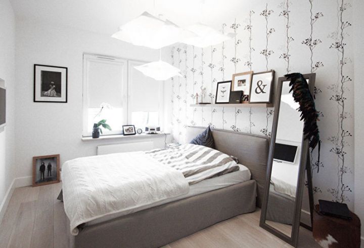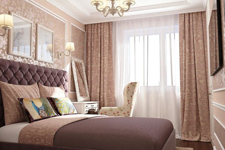 Оформити маленьку спальню доцільно з використанням простих малюнків на стінах, світлих штор та немасивних меблів.