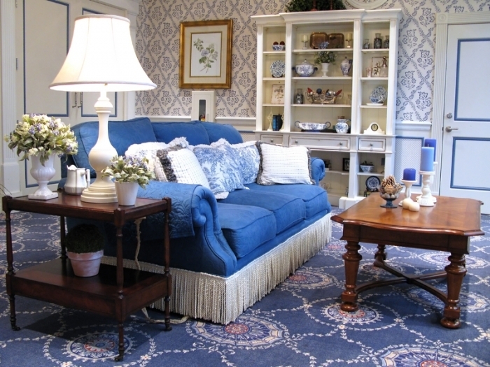 У такій тематиці кантрі відрізняється великою кількістю світла та повітря. Оздоблення стін вітальні виконується пастельними фарбами, а підлога повинна бути з простих нефарбованих дощок. Для меблів беруться натуральні матеріали, зазвичай, тонована деревина. Ручні половики та прості чохли у біло-блакитних тонах – головні елементи текстилю. Обов’язковою умовою вітальні є відсутність вишуканих деталей. Начиння зроблена з міді, а на стінах розвішані картинки із сільським життям.