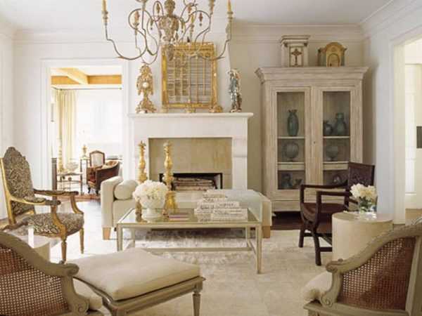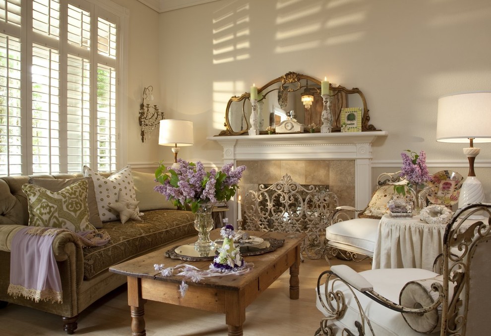 - В обробці є наліт старовини, нерідко це бувають спеціально зістарені і грубуваті поверхні, меблі, що імітує антикваріат, тканини з нальотом бляклості та вицвітання. Добре вписуються в інтер’єр та етнічні речі, наприклад, індіанські ткані скатертини, російські ручні підлоги, французькі мережива.