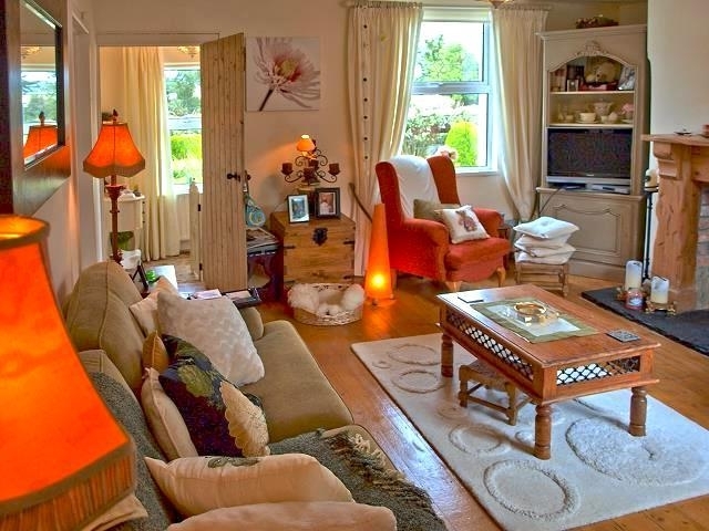 Вітальня в стилі кантрі має безліч декоративних елементів. Часто ці предмети так званого хендмейда, тобто зроблені своїми руками.