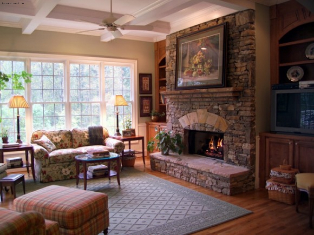 Для віталень заміських будинків підійде і декоративний камінь або більш економний варіант – керамічна плитка великих розмірів, за кольором подібна до іншої обробки.