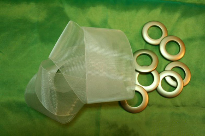 Замість шторної стрічки можна використовувати люверси. Це спеціальні кільця, що складаються із двох частин. Для початку до верхнього краю портьєри приклеюють стрічку, що ущільнює. На ній відзначають місця розміщення кожного люверса. Зазначені частини прорізають, туди вставляють кільця та закріплюють їх.