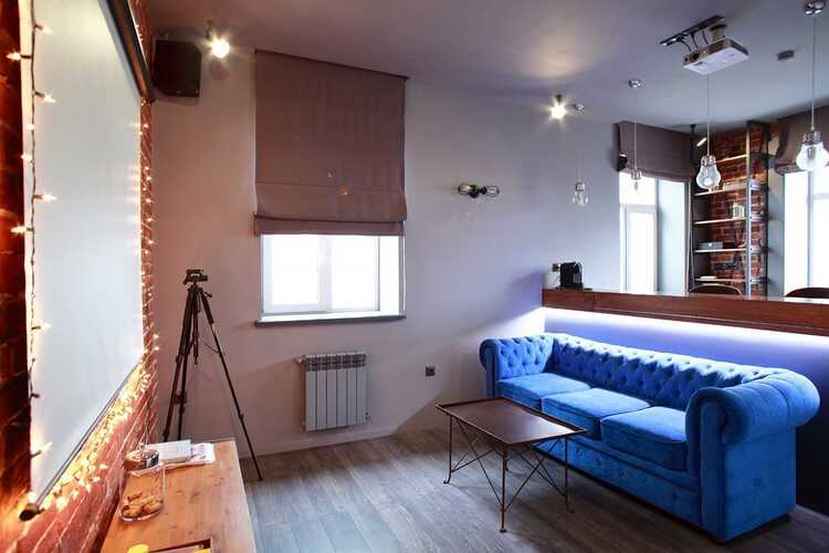 Більш оригінальна альтернатива чорно-сірим інтер’єрам – відтінки синього. У лофті зазвичай використовуються темні та приглушені тони, на кшталт потертої джинси, брудно-бірюзового, сапфірового, кобальту, відтінків грозового піднебіння. А ось для акцентів підійде насичений блакитний, ультрамариновий чи індиго.