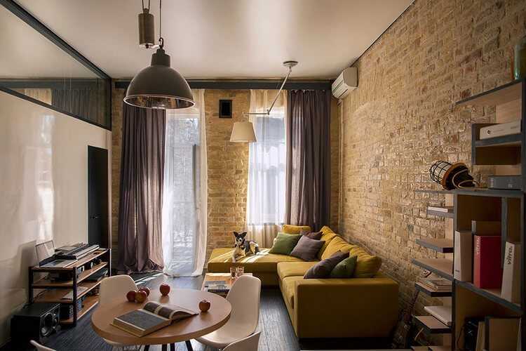 Строгий дизайн вітальні зі зручним диваном і темною цегляною стіною, яка ідеально вписується в загальну концепцію стилю лофт