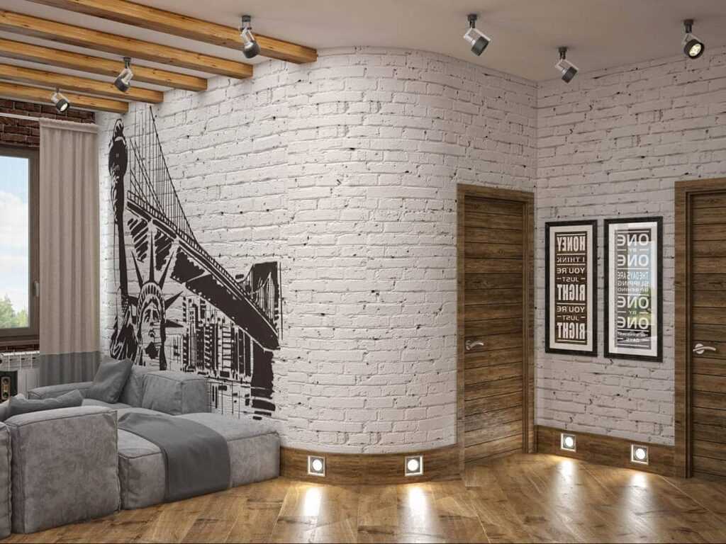 На фото вітальня в лофтовому стилі з білим оздобленням стін.