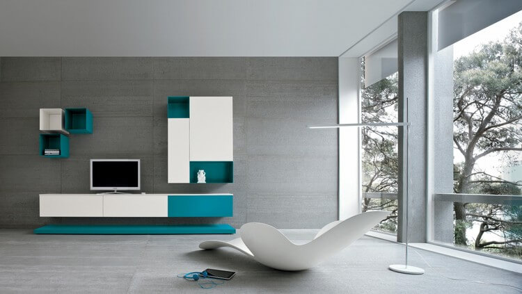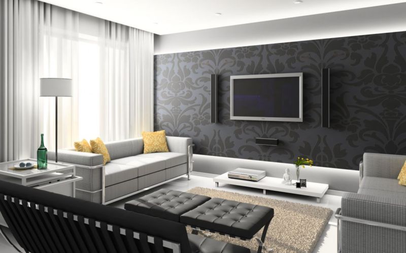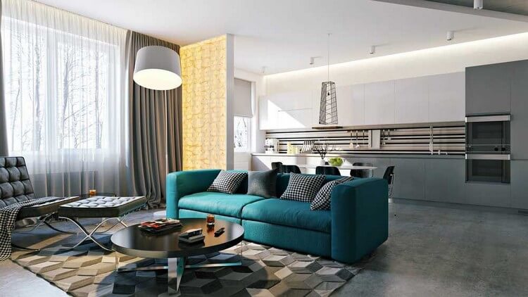 Вишукано в кімнаті виглядає частина стінки або диван бірюзового відтінку, де переважає сірий колір. Також оригінально виглядатиме червоне крісло на чорно-білому тлі. Сталева палітра чудово поєднується з синім та фіолетовим кольором.