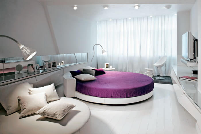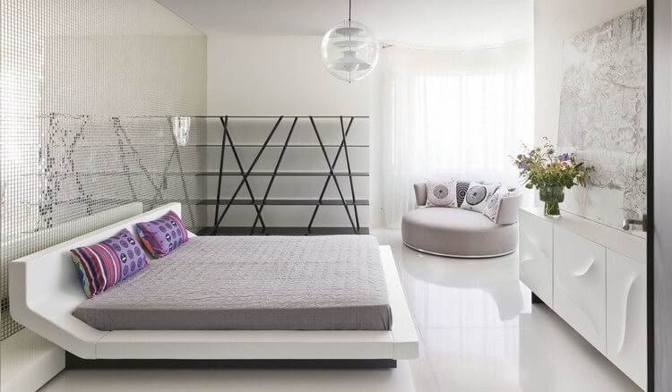 Пом’якшити діяльність хай-теку дозволено в спальні. Досягається це зменшенням скла і металу і впровадженням “затишних” елементів – плодів, декоративних подушок або килимка з довгим ворогом.