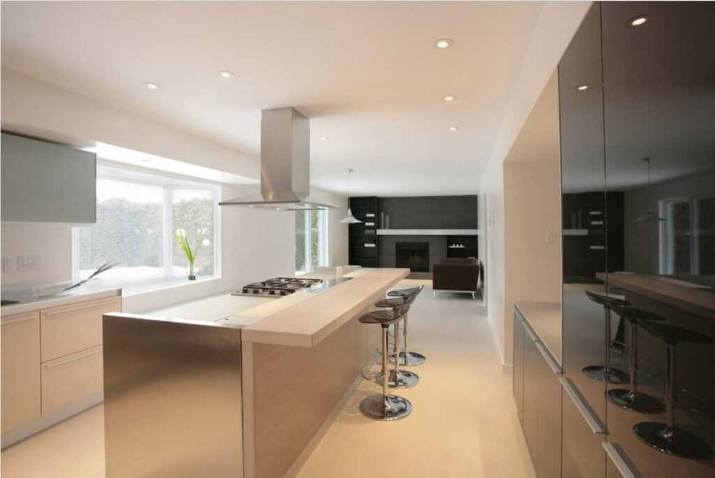 Обідній стіл може бути зі скла, каркас стільців – із хромованого металу. Особливу увагу слід приділити джерелам світла: вони повинні висвітлювати робочу та обідню зони, а також підсвічувати шафи та полички.